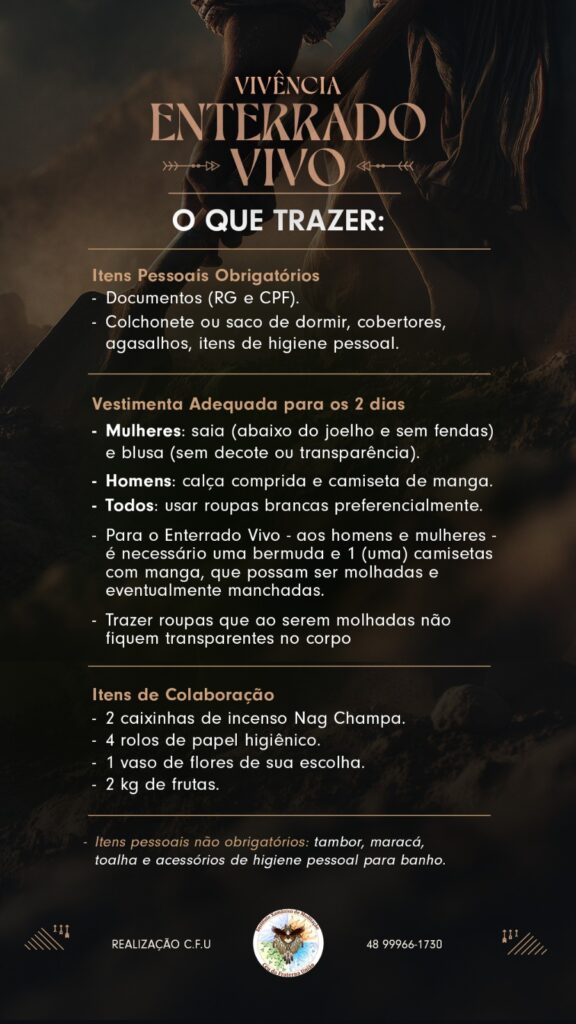 O ritual do Enterrado Vivo é a oportunidade de grandes transformações e de Vitórias, quem vier que esteja decidido a enfrentar si mesmo, as próprias mazelas e a deixá-las no abraço da mãe TERRA, simples assim.